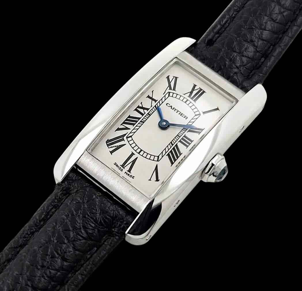 Boîtier rectangulaire en or 18K au design allongé typique de la collection Américaine, cadran clair à chiffres romains, minuterie chemin de fer et aiguilles bleuies. Mouvement Cartier à quartz – couronne perlée sertie d’un cabochon bleu et bracelet en cuir haut de gamme avec boucle ardillon assortie.