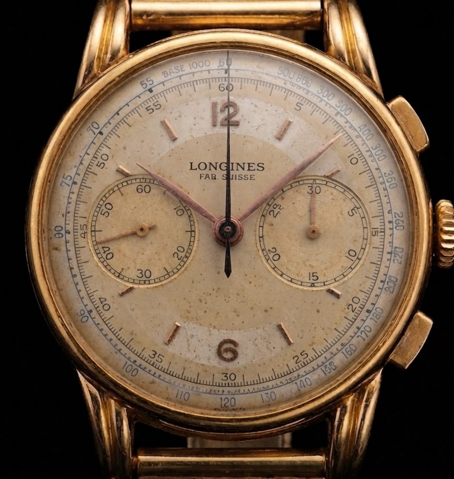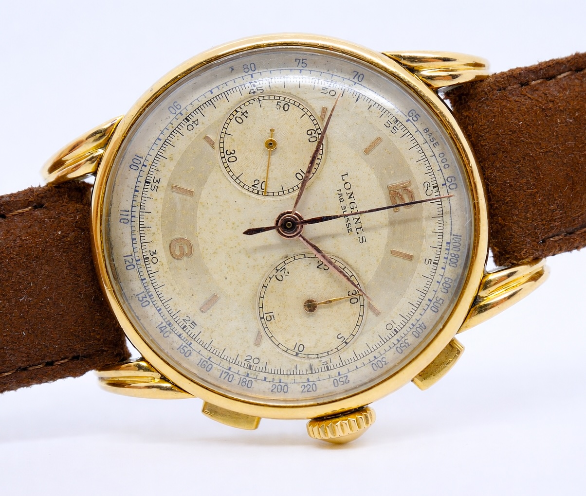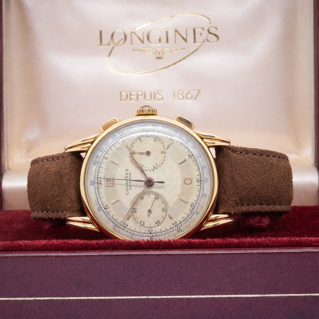 Chronographe Longines calibre 30CH avec boîtier français en or 18 carats des années 50, un véritable joyau de l’horlogerie suisse, conservé en parfait état et jamais poli.