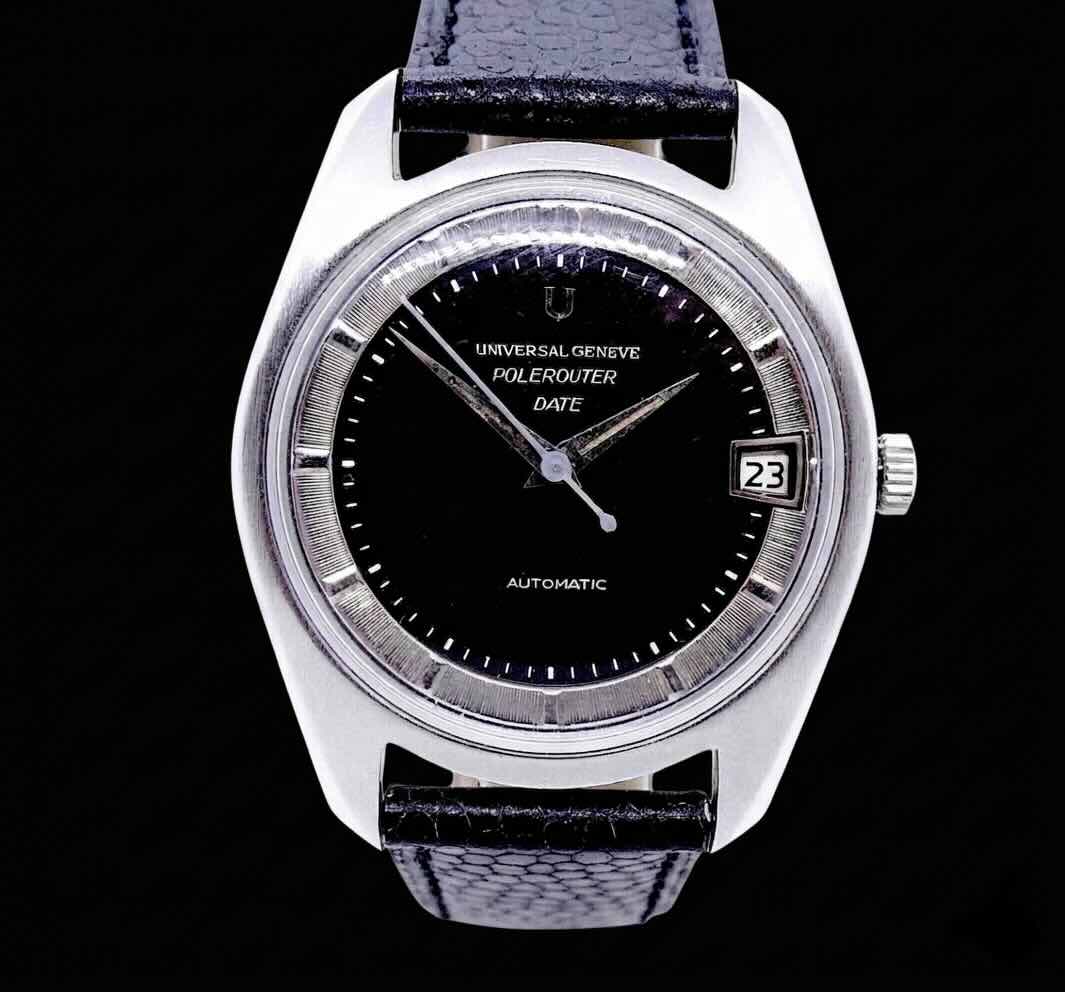 Montre automatique suisse vintage Universal Genève Polerouter Date, calibre 1-69 Micro Rotor. Dimensions du boîtier acier asymétrique: 35 mm sans couronne.